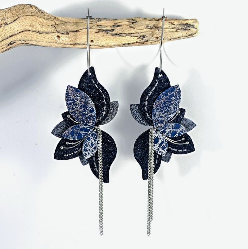 Chaque pétale est découpé dans des cuirs bleu marine, bleu jean et argenté, cousu à la main avec soin, orné d'étamines et de fines chaînes argentées. La fleur est ensuite suspendue à une fine créole en acier inoxydable.