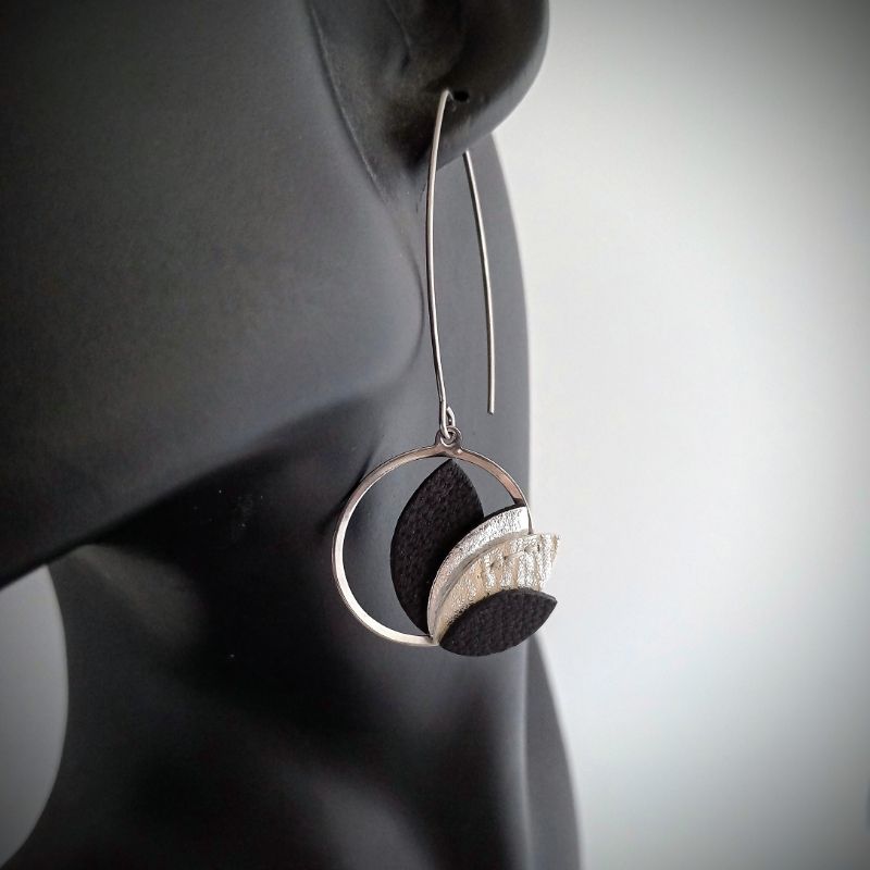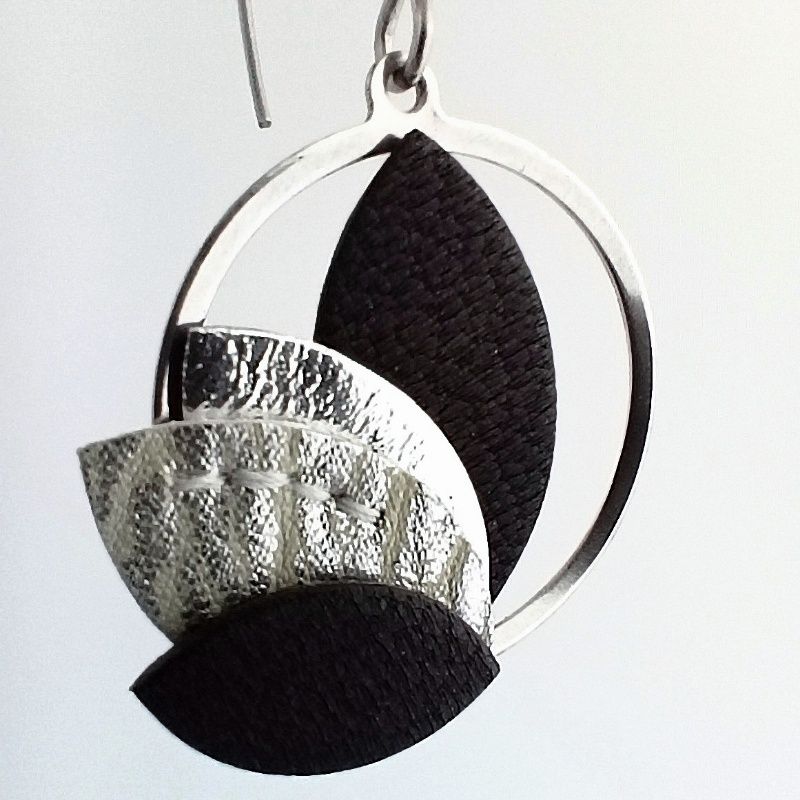 Les boucles d'oreilles Calista évoquent un petit jardin suspendu : quatre feuilles de cuir cousues à la main sur des anneaux, chacune légèrement différente par sa forme ou sa taille. Légères et aériennes, elles se balancent au bout de crochets argentés, dessinant un mouvement doux à chaque geste.