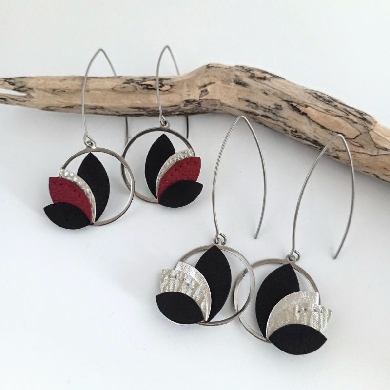 Boucles d'oreilles Calista - Cuir rouge et noir ou noir et argent