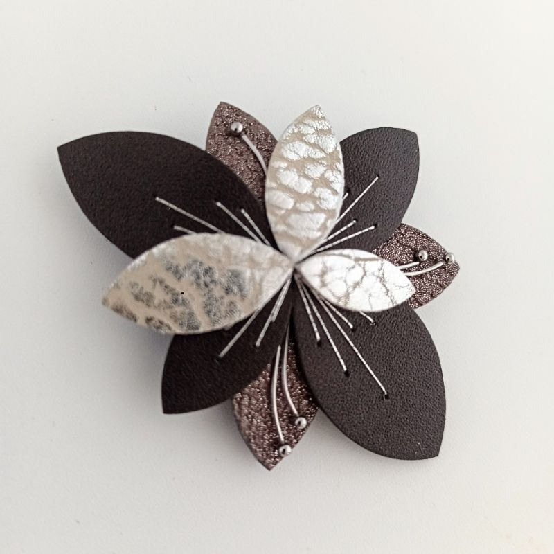 Entre ombre et lumière, la broche Luna Bloom coloris Ombre Givrée unit des cuirs marron froid, sable et argent pour une broche raffinée, brodée main au fil argenté et ponctuée d’étamines en acier inox.
