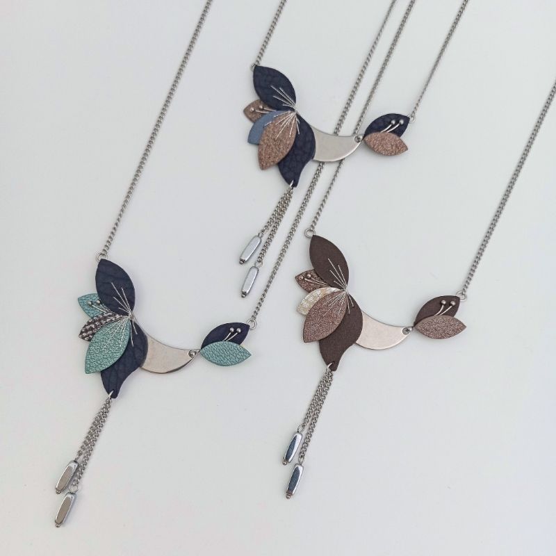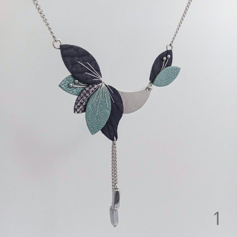 Collier Lyria, bijou poétique en cuir brodé main et acier inoxydable argenté. Ses pétales aux reflets violets, bleutés et bruns dessinent un éclat léger, inspiré du mouvement des ciels changeants.